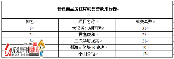 十一月第一周株洲新建商品房周成交量排名第一的是大汉希尔顿国际,总成交套数为31套;位居第二的楼盘为君逸康和,总成交套数为27套;排名第三的为三兴华府龙苑,周成交总量围21套。