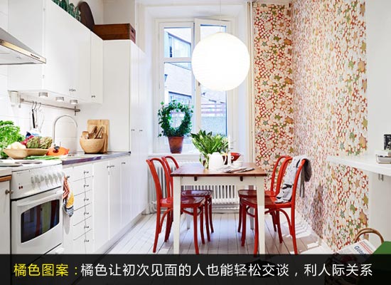 想要从餐厅提升人际关系运,小编建议用橘色的花朵图案的手绘墙或者壁纸,橘色的花朵图案能让即使初次见面的人也能轻松交谈,从而能提升你的人际关系。另外也可以考虑使用暖色系得花纹图案作为餐厅的墙面,也可以起到同样的效果噢!