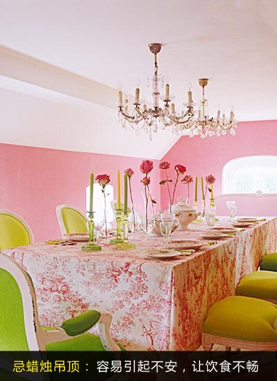 很多人会喜欢在餐厅中以吊灯作为装饰,但是有些吊灯由几枝蜡烛形的灯管组成,虽然设计新颖,颇有观赏价值,但若把它悬挂在餐桌之上,容易引起不安,让饮食不畅,影响健康。客厅灯具最好宜圆形为主,这样有团圆美满之意。