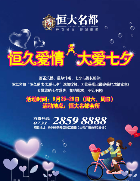 8月25日-26日(本周末),株洲恒大名都“恒久爱情·大爱七夕”即将浪漫来袭,真情邀约天下有情人。这个周末,别忘了带着属于你的ta,赴约恒大名都,享一场最完美的七夕盛典,为您和爱人的浪漫之约留下一段美好回忆!