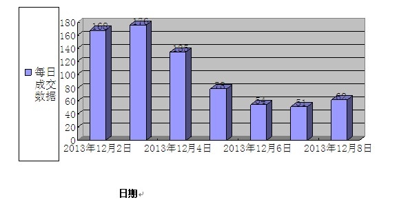 从单个日成交套数来看,上周第二天(12月3日)的成交达到了本周最高点,成交176套,约占周成交量的24.31%。上周第六天(12月7日)的成交达到了本周最底点,成交51套,约占周成交量的7.04%。