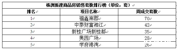 据0731房产网株洲站数据统计显示,在新建商品房网签套数排行榜前五名中,天元区有2个项目入榜;荷塘区,芦淞区和云龙示范区均有1个项目入榜;其中排名前五的楼盘分别为福鑫南郡,中泰财富湘江,新桂广场新桂都,奥园广场,学府港湾。