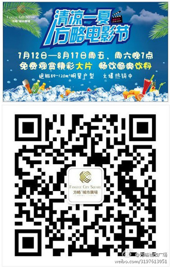 即日起,只要你扫一扫官方微博或者官方微信二维码,就可以到现场免费领取饮料!每周末晚上还可以观赏精彩大片,看着周边的广场舞,或与朋友三两交谈。你可以感受清凉,在这个夏日里收获好心情。