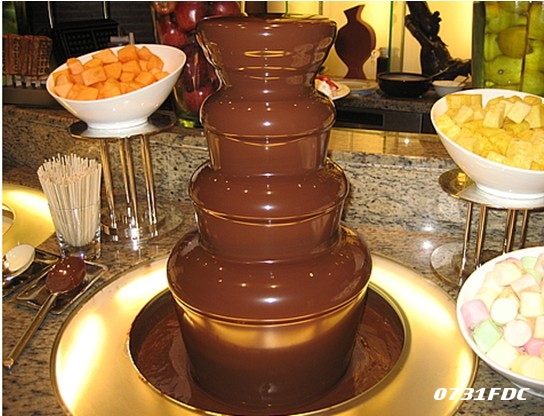 在活动现场,记者看到,展台上有一座旋转着的“巧克力塔”,后来才知道,它的学名叫做意大利巧克力瀑布火锅,它的原理是:火锅内部不断产生热量,将巧克力融化,而在它的底部有一圈冰水,可以迅速将融化的巧克力凝固。