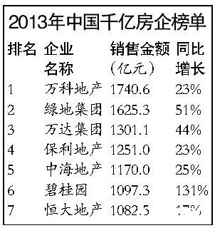 排行榜显示,万科以1776亿元的销售成绩再次蝉联冠军,同比增长23%,绿地和保利两家去年的“千亿房企”紧随其后,而万达、中海、碧桂园与恒大4家房企也强势进入“千亿俱乐部”。【扩展阅读:各地争抢“地王” 土地财政是高房价的充气筒】