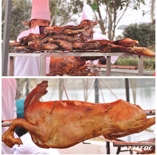 当日,专业的厨师和工作人员早就搭好架子,精心秘制烤全羊。