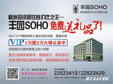 (0731房产网株洲站讯 李兰英)株洲投资居住性价比之王——丰园SOHO免费送礼品了!40㎡小户精装商务公寓全现房发售,震撼来袭,VIP1万抵2万火爆认筹中,全城酒店式服务管理,仅此108席。居住/品牌家具家电、精致厨卫、即买即住!投资/每月固定返租回报、返租期限由您定!
