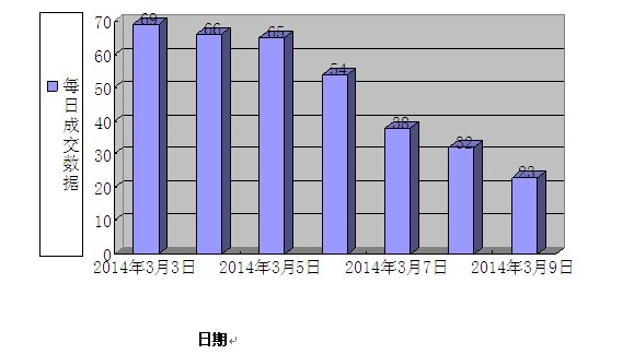 0731房产网株洲站数据统计显示,从周成交整体上看,3月首周(3月3日-3月9日)每日成交平均维持在50套左右,与前一周(2月24日-3月9日)63套相比略有下降。