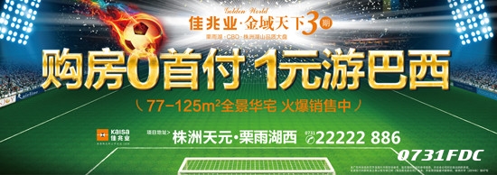 (0731房产网株洲站讯 李兰英)去巴西,看世界杯现场!谁说不可能!随着2014年巴西世界杯赛事的临近,株洲佳兆业·金域天下3期推出“购房0首付,1元游巴西”购房特惠活动。这意味着,不仅能轻松拥有株洲最具品质的山湖美宅,更有一次让你亲临巴西的难得机会。而本次活动,并非以抽奖形式来考验运气,而是人人都有机会,快点行动起来,加入巴西桑巴之旅!