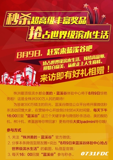 为答谢390万倾注的目光,蓝溪谷微信公众平台将开展微信秒杀活动回馈大家,在营销中心开放倒计时的4天时间里,每天下午16:00回复“蓝溪谷”这三个关键字参与微信秒杀活动,美的酸奶机、榨汁机、煮蛋器等你带回家!更有终极大奖IPADMINI等你哦!