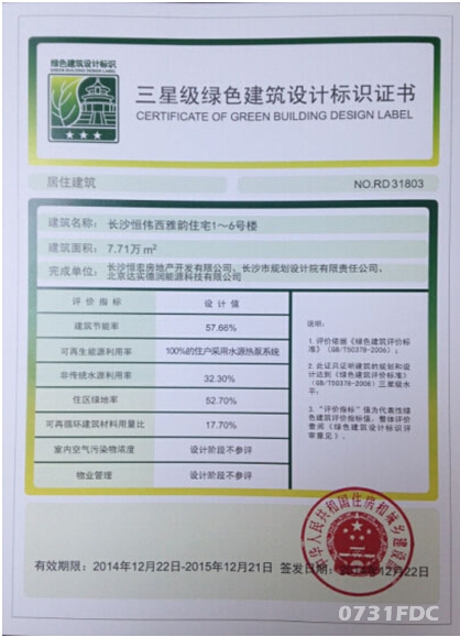 恒伟•西雅韵公馆【楼盘 论坛 地图】作为中国首个两型生活示范小区、湖南唯一三星标准绿色住宅,在绿色建筑这一条道路上可以说走在了行业前列。2014年8月13日,恒伟·西雅韵被长沙市住房建设委员会正式授予“长沙市两型住宅产业化示范项目;2014年11月20日,国家住建部评定为“2014年度全国绿色建筑评价标识推荐项目”。