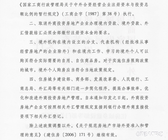 此次出台的文件提出,外商投资房地产企业注册资本与投资总额比例,按照《国家工商行政管理局关于中外合资经营企业注册资本与投资总额比例的暂行规定》执行;取消外商投资房地产企业办理境内贷款、境外贷款、外汇借款结汇必须全部缴付注册资本金的要求;境外机构在境内设立的分支、代表机构(经批准从事经营房地产的企业除外)和在境内工作、学习的境外个人可以购买符合实际需要的自用、自住商品房。对于实施住房限购政策的城市,境外个人购房应当符合当地政策规定。住房城乡建设部、商务部、发展改革委、人民银行、工商总局、外汇局等有关部门进一步简化程序,提高办事效率,优化和改进外商投资房地产管理。