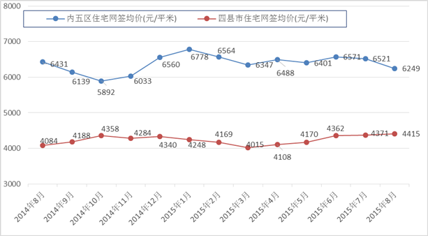 2015年8月,长沙内五区住宅成交均价为6249元/平米,环比下降4.17%,同比去年下降2.83%。8月长沙主城区住宅成交量有所回升,但价格下滑明显,开发商以低价促销胡行为得到数据印证。