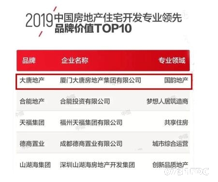 2019年9月10日下午,由国务院发展研究中心企业研究所、清华大学房地产研究所和中国指数研究院三家单位联合举办的“2019中国房地产品牌价值研究成果发布会暨第十六届中国房地产品牌发展高峰论坛”在北京雁栖湖会议中心举行。大唐地产获评2019中国房地产住宅开发专业领先品牌价值TOP10。
