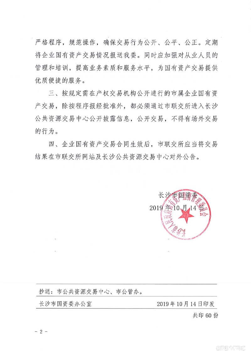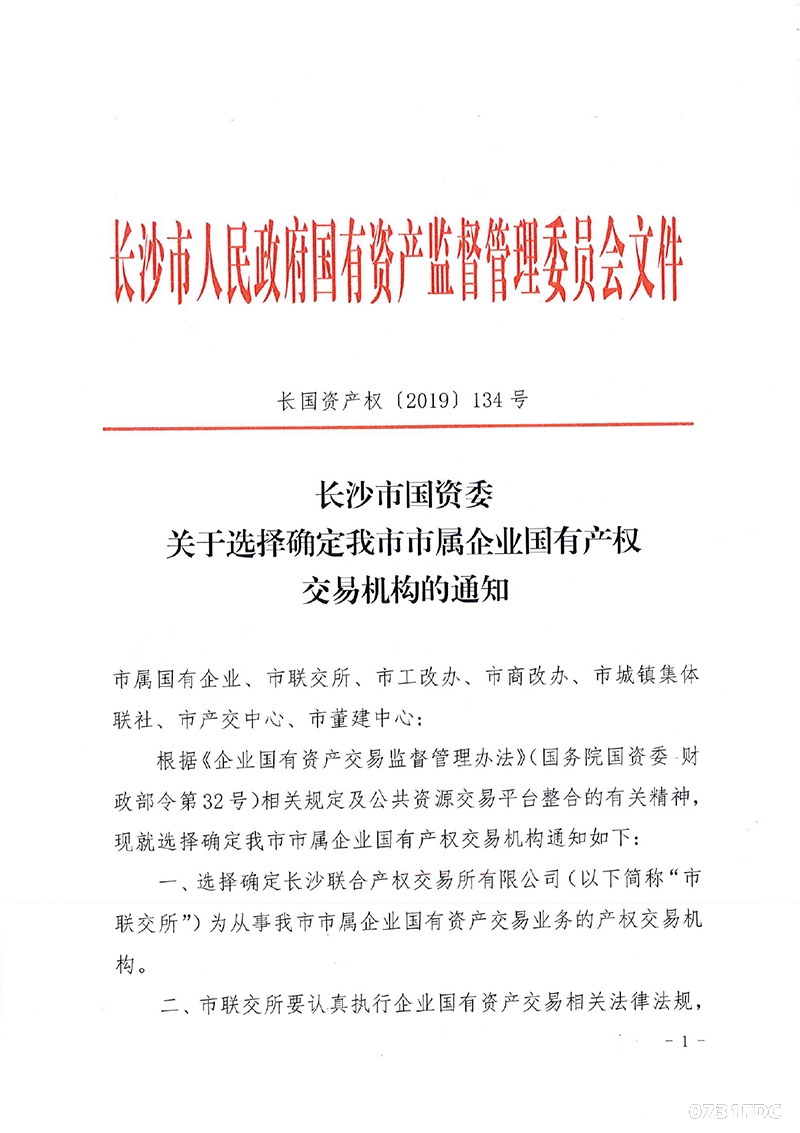 《长沙市国资委关于选择确定我市市属企业国有产权交易机构的通知》(长国资产权〔2019〕134号)