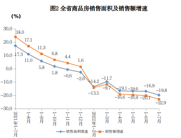 1-7月,全省商品房销售面积3975.61万平方米,同比下降19.8%。其中,住宅销售面积下降22.3%,办公楼销售面积下降16.5%,商业营业用房销售面积增长1.2%。