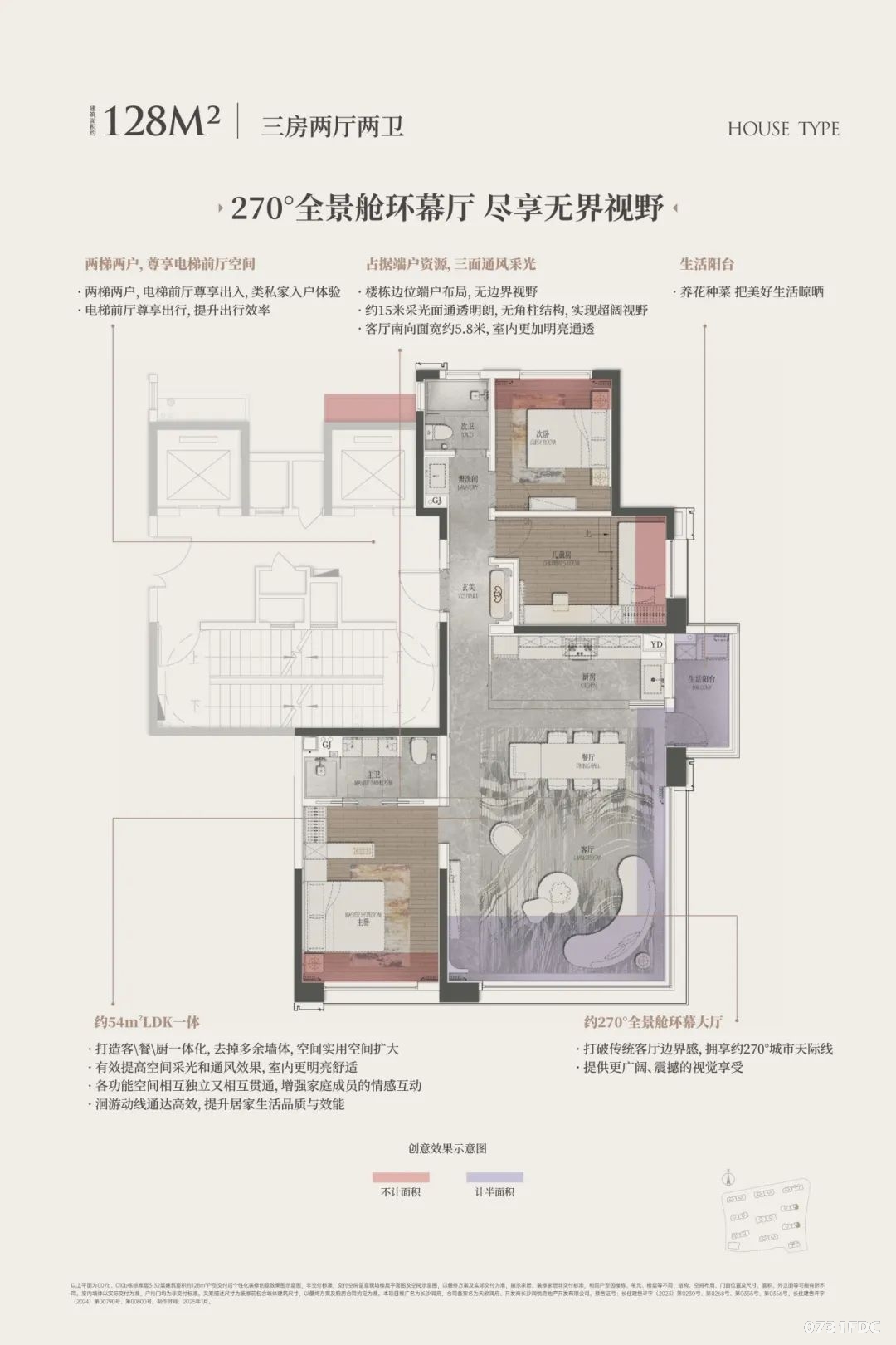 作为全景舱产品之一,拥有270°全景舱环幕厅,让您仿佛置身于城市的巨幕影院,将无界视野尽情收藏。以及占据端户资源,约15米采光面和无柱结构,约54㎡LDK一体宽幕客厅,实现室内全明通透采光,空间利用率远超市面上大部分同类户型。
