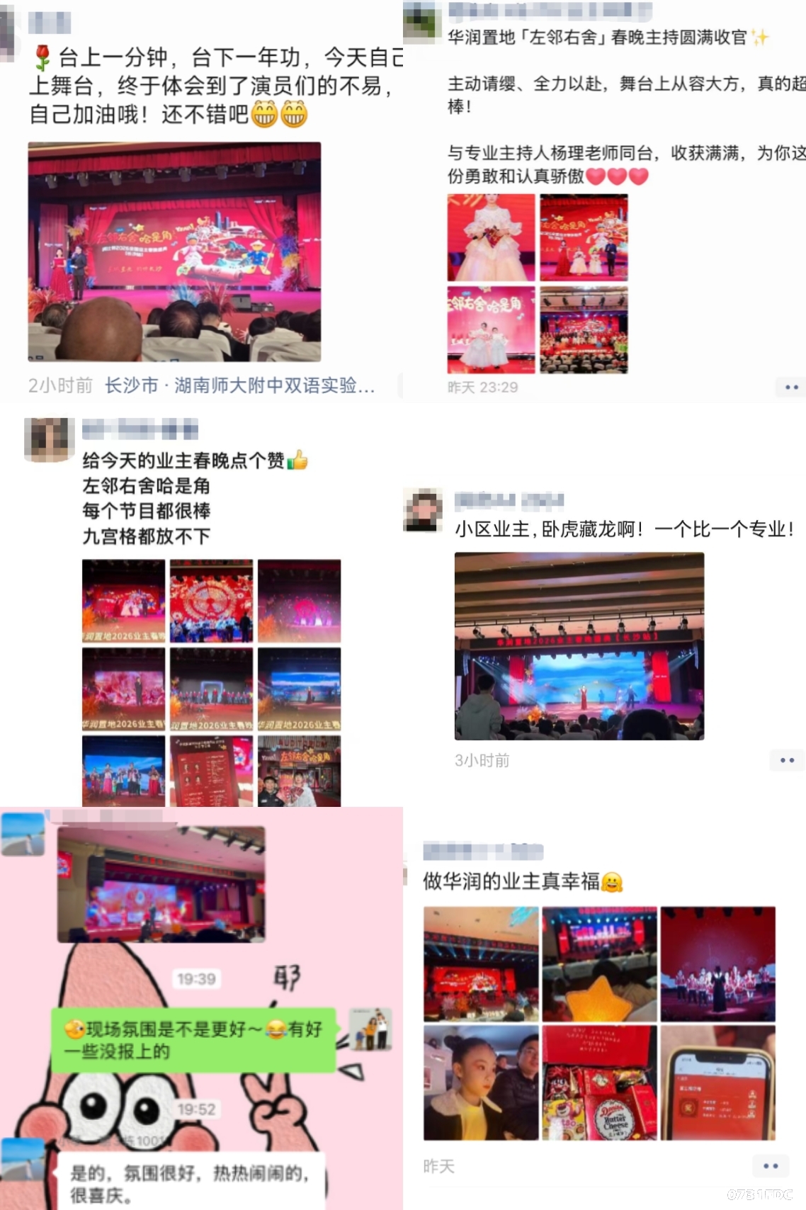1月25日,长沙小雨,户外最低气温3°,但师大附中双语学校北校区内却是一片暖意融融。华润置地润比邻2026全国业主春晚盛典长沙站在此圆满举行,千余名业主演员、观众齐聚一堂,共同见证了一场由业主和开发商共创的社区文化盛宴。