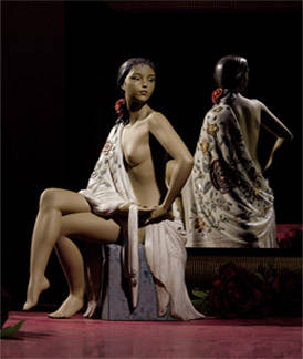 创作灵感来自于法国作曲家比才的歌剧《卡门》中的主角。自由、独立、掌握自己的命运,同样这件作品也充满了卡门般的力量与才情。这件雾彩的大型雕塑 ,以细腻质感的人体与鲜艳的披巾形成有趣的对比。少女身上的披巾以珐琅绘饰,并用精湛的陶瓷技艺做出像是在真正的丝绸上绣花的逼真效果。