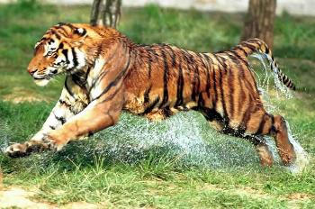 成年华南虎在临行前戏水狂奔。新华社记者陈天湖摄(数码传真照片)