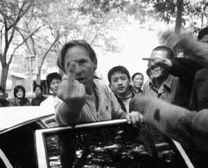 记者随即举起相机,刚要拍照,他赶忙转过身去,用手捂住脸,随后,朝记者冲了过来,挥舞着拳头,大声骂着“Fuck!”追打记者。这时,一位身穿白色上衣的中年妇女用很标准的英语告诉他,这在中国是违法的,希望他不要冲动。他转过身去,把屁股冲这位女士翘了起来,口里不停地骂着极其下流、不堪入耳的脏话。