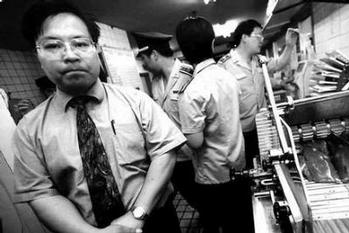 | | SOGO工作人员(左一)昨天在陪同检查时始终一脸严肃■摄影/贾婷 |