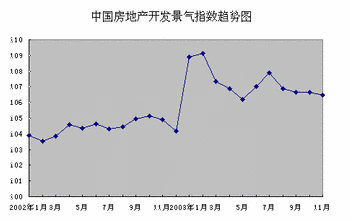 国家统计局最新测算的全国房地产开发景气指数结果表明:11月份,全国房地产开发景气指数为106.45,比去年同月上升了1.55,比10月份回落0.22点。但“国房景气指数”已经连续4个月保持在106点以上的水平。11月份,“国房景气指数”所属的8个分类指数与10月份相比,呈现2升6降的格局。其中,竣工面积、土地开发面积、商品房平均销售价格、土地转让收入、商品房空置面积和资金来源分类指数呈现下降趋势;房地产开发投资、新开工面积分类指数继续保持上扬势头。
