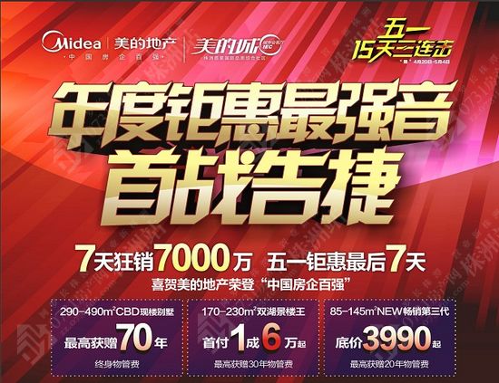 (0731房产网株洲站讯 李兰英)中国房企百强——美的地产以最高品质奉献株洲,株洲第一盘美的城的“五一•15天•三连击”活动持续火爆,营销中心现场抢筹客户络绎不绝,每日来访高达200余组,7天劲销7000万!2013年美的城再续株洲楼市销售传奇!时至五一黄金长假期间,美的城最后7天钜惠终极风暴重磅来袭,20万豪礼抽奖等你来取。同时,继4月美的城运动会第一季的完美收官,美的城在五一期间还将在栗雨湖畔开启春季踏青运动会第二季。好礼不断,惊喜连连,全家老少先前冲!