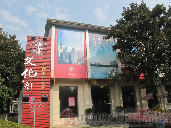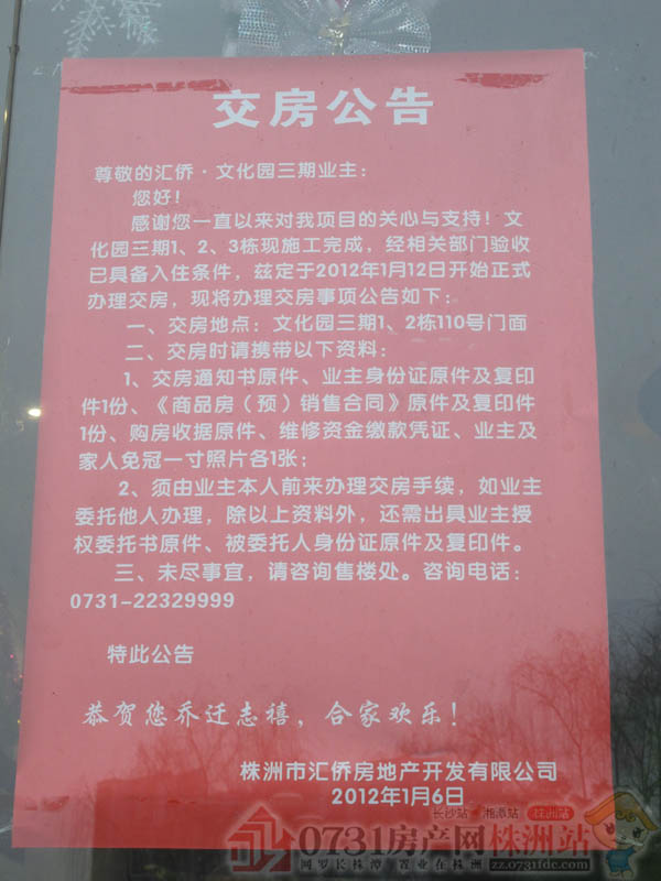 文化园的营销中心就在株洲市图书馆的旁边,营销中心门口仍旧贴着1月份的交房公告