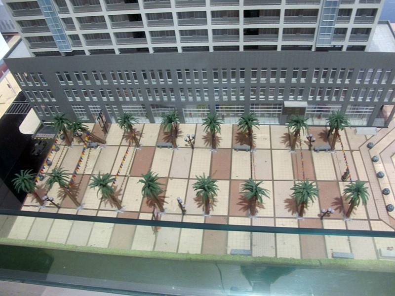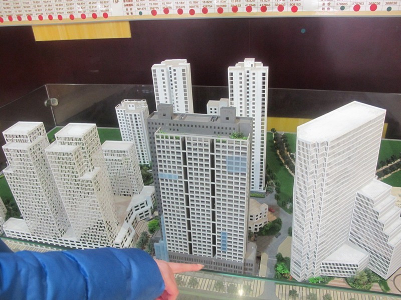 这是丰园广场的一个规划模型,这一片将会打造成为一个商业休闲一体的城市综合体。近期的主打楼盘还是丰园大厦,模型中间的那栋高楼就是丰园大厦,丰园大厦最高的有31层,低的有29层,楼顶是一个空中花园。底下的几层,打造的是一个商业购物区,5楼以上可以做家庭住宅,也可以做为办公写字楼。特别适合贸易公司以及驻株洲办事处、个人工作室,充分满足客户不同的需求。